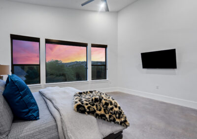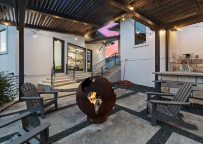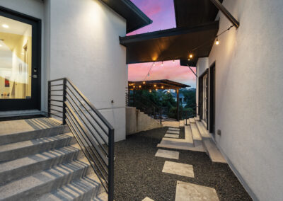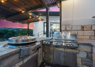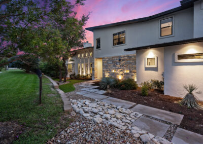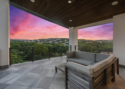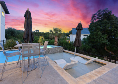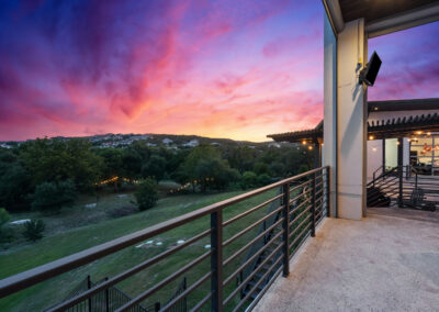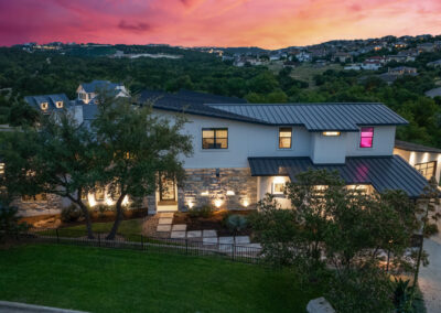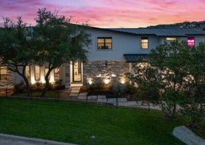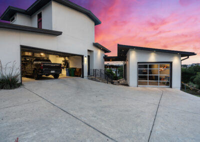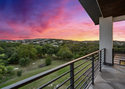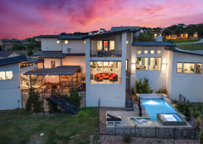 Nestled on one of Creekside at Flintrock premier lots, this luxurious home offers hill country living in one of West Austin’s most desirable areas – Lakeway at Lake Travis. Designed by Marley Porter and built by Trademark Luxury Builders, this residence boasts an expansive open-concept living space, striking ceilings, and a stone-accented fireplace—all framed by breathtaking views. Culinary enthusiasts will revel in the kitchen’s exquisite design complete with elegant cabinetry, marble countertops, and cutting-edge appliances. A dedicated bar area with a wine cellar and walk-in pantry elevates entertaining to a whole new level. The primary suite serves as a wonderful retreat, featuring a modern spa-inspired bath with a generous soaking tub, oversized shower, and dual walk-in closets. The suite is complemented by a sophisticated executive office and coffee bar. Convenient first floor half bath and oversized laundry next to the 2 car garage. A separate 1 car garage provides a 100 sq.ft. studio making for additional work/play space. Upstairs, a third living area beautifully connects three additional bedrooms to a covered balcony. The guest suite has an ensuite bath while bedrooms 2 and 3 share a Jack n Jill bath all with walk in closets. Set on an expansive 1.48-acre parcel, the outdoor living area invites you to a spacious patio, a sparkling pool and spa, a cozy fire pit, and a fully-fenced yard—perfect for outdoor gatherings and soaking in the serenity of this exceptional setting. The street consists of only 10 homes with large lots offering exceptional privacy and tranquil breezes.