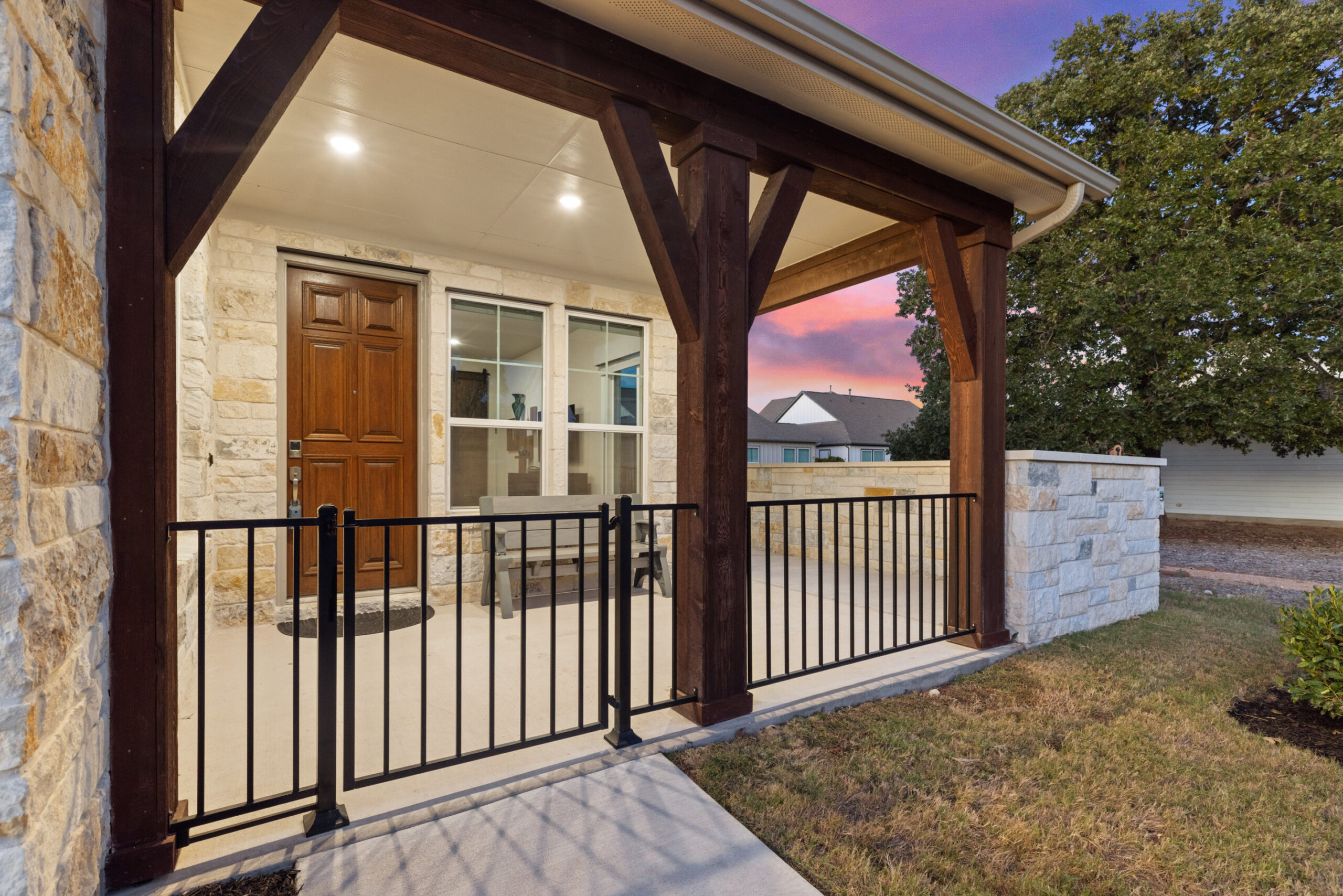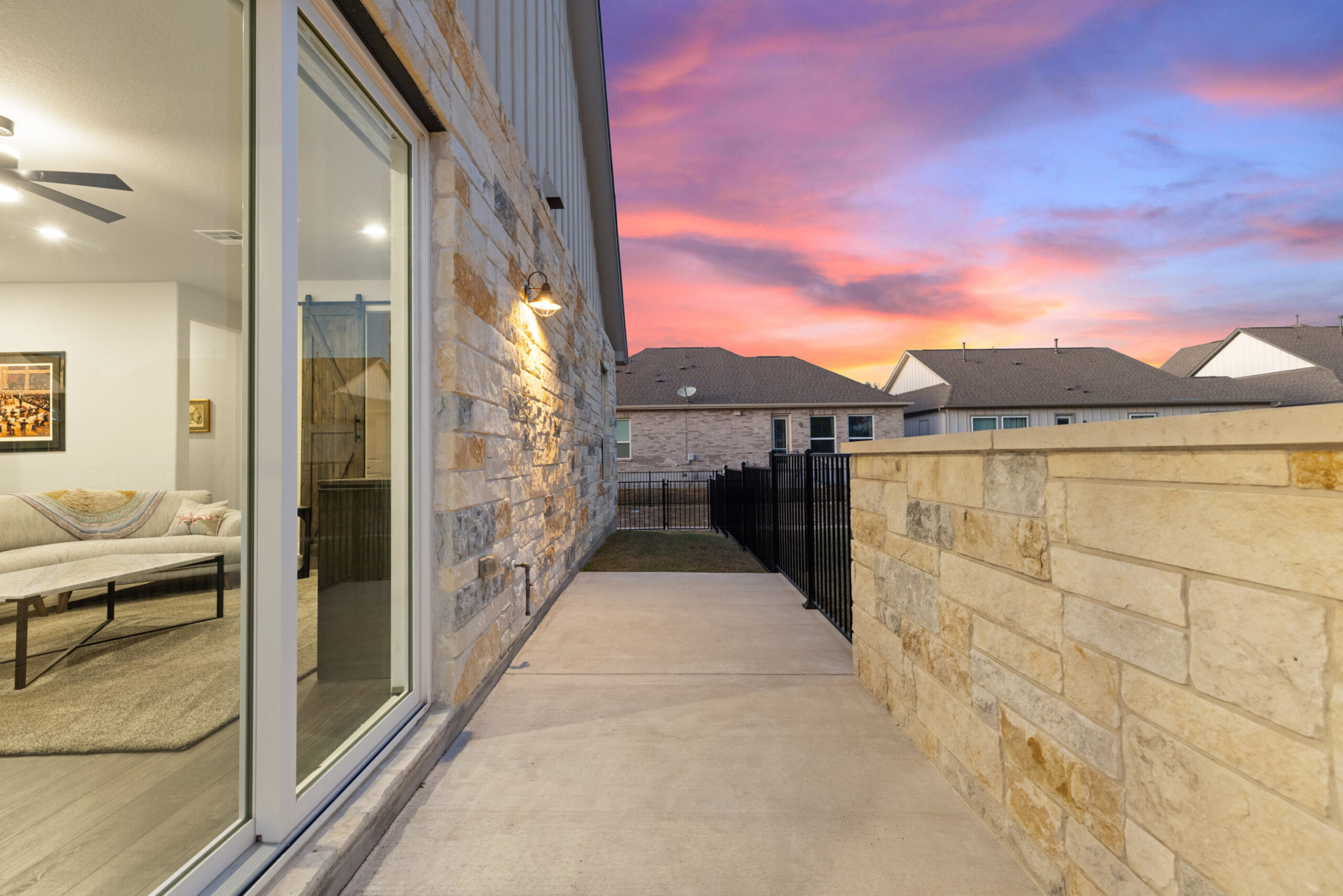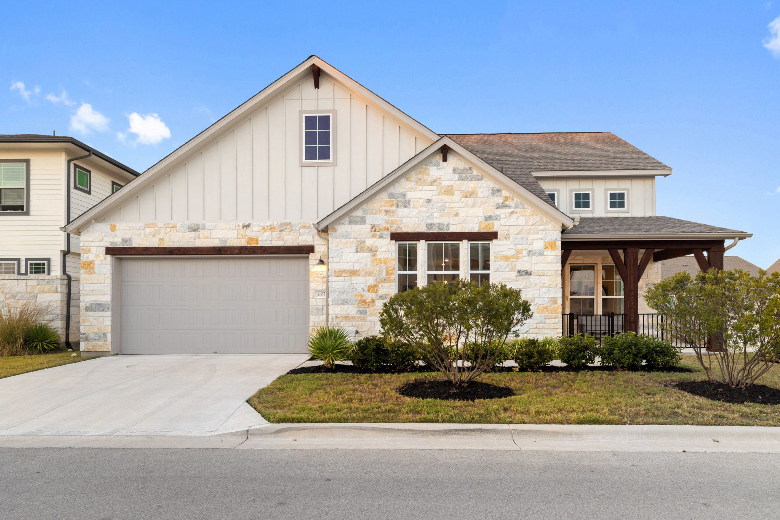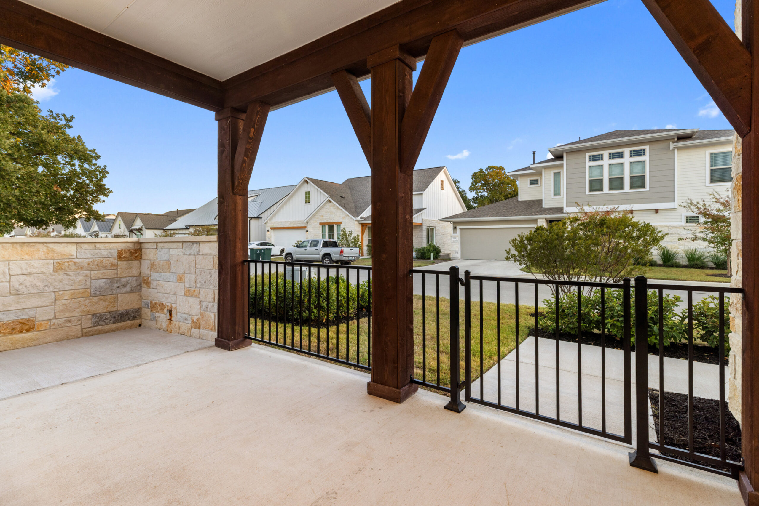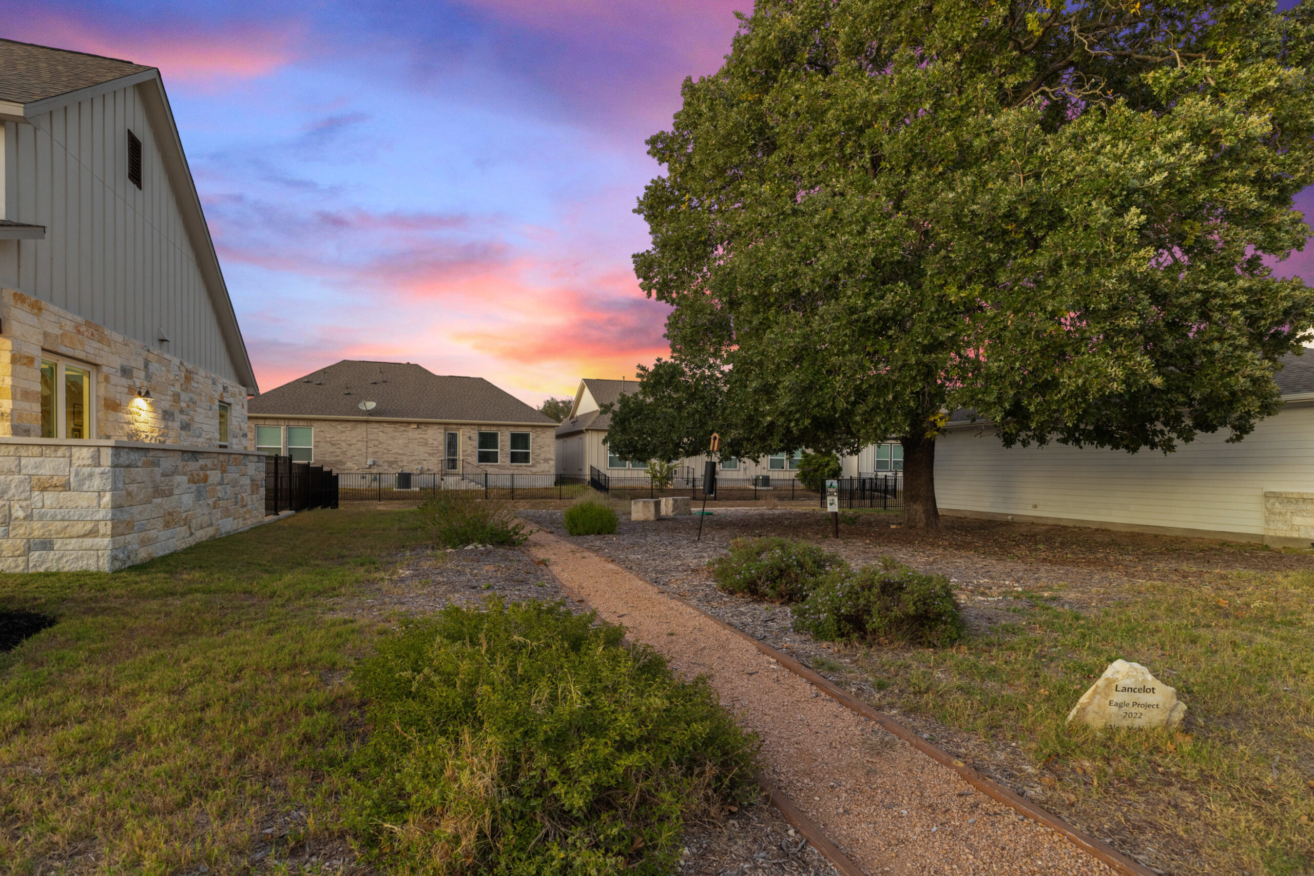 Welcome home to gated living in The Retreat at Dripping Springs. Built in 2021 by Brookfield, this modern farmhouse style detached condo is sure to please: 1,955+/-sq.ft., 3 bed, 2.5 bath, 2 live, 1 dine, 2 car garage luxurious finishes throughout. A unique locale next to the park lends to added privacy. The covered front porch entry provides a wraparound patio with stone half wall, gas stub out for a grill + a fenced in back yard for pets. Step inside to find a tranquil open floor plan awash in natural light. The living, dining and kitchen are spacious rooms under tall ceilings – perfect for the holidays and entertaining. The ceiling space even continues into the garage offering ample storage. All appliances convey including the fridge washer & dryer making for a true turn key opportunity. The gorgeous kitchen has been upgraded with tile backsplash, waterfall counter at the island, water softener plus LVP flooring throughout this amazing home. Comfortable live/work in the study with custom barn doors, huge closet and a one of a kind view. The bedrooms are spacious and the primary boasts a stunning walk in shower, dual vanities, and huge walk in closet. The community only has 70 homes sharing a beautiful pool with tanning ledge, spa & lounge chairs plus a dining pavilion with grill, firepit & restrooms. Excellent locale with short walks to DSHS & downtown. Come enjoy easy living in this little hill country secret close to it all. Its here waiting for you to call it “Home.”