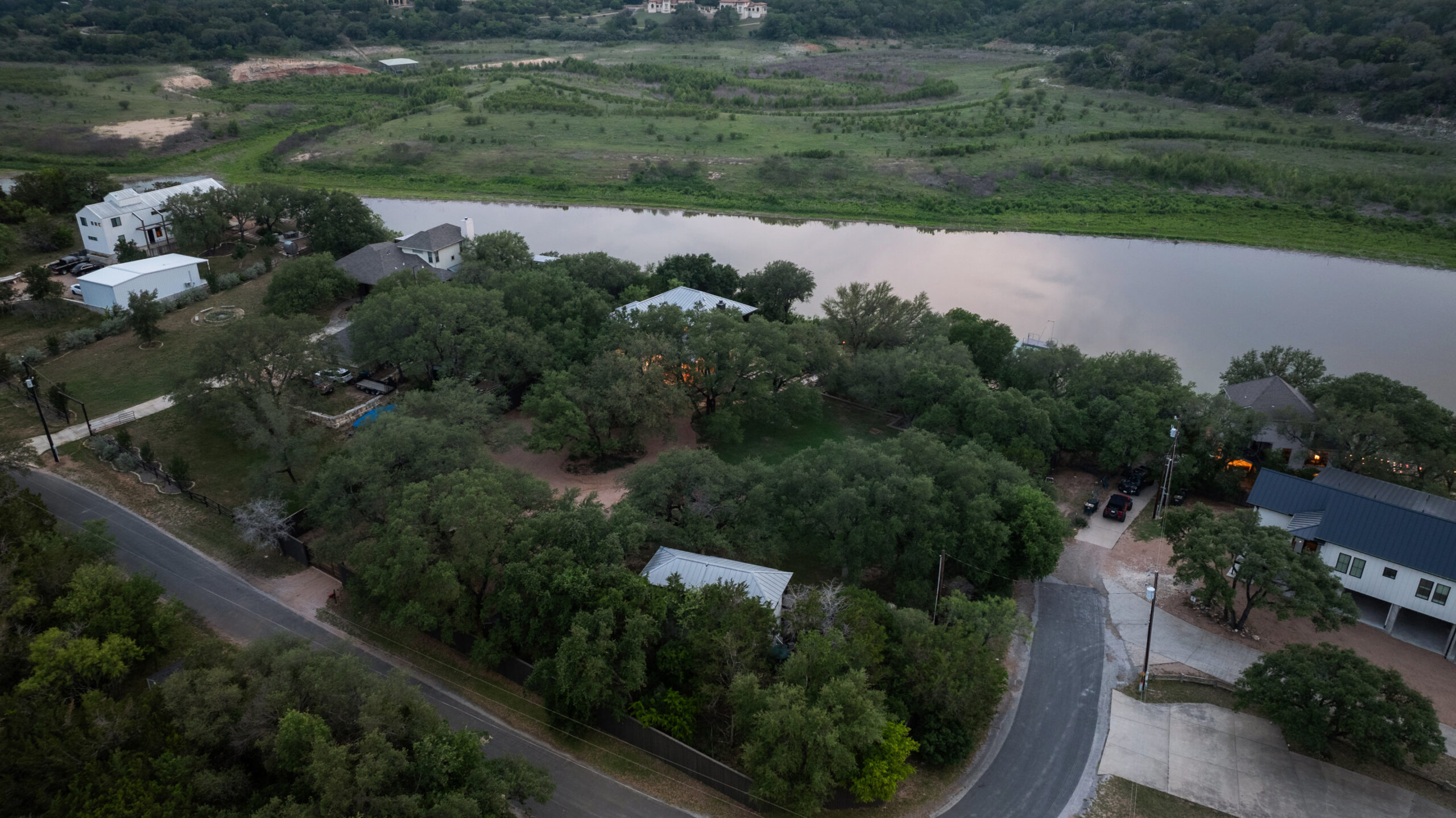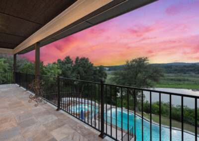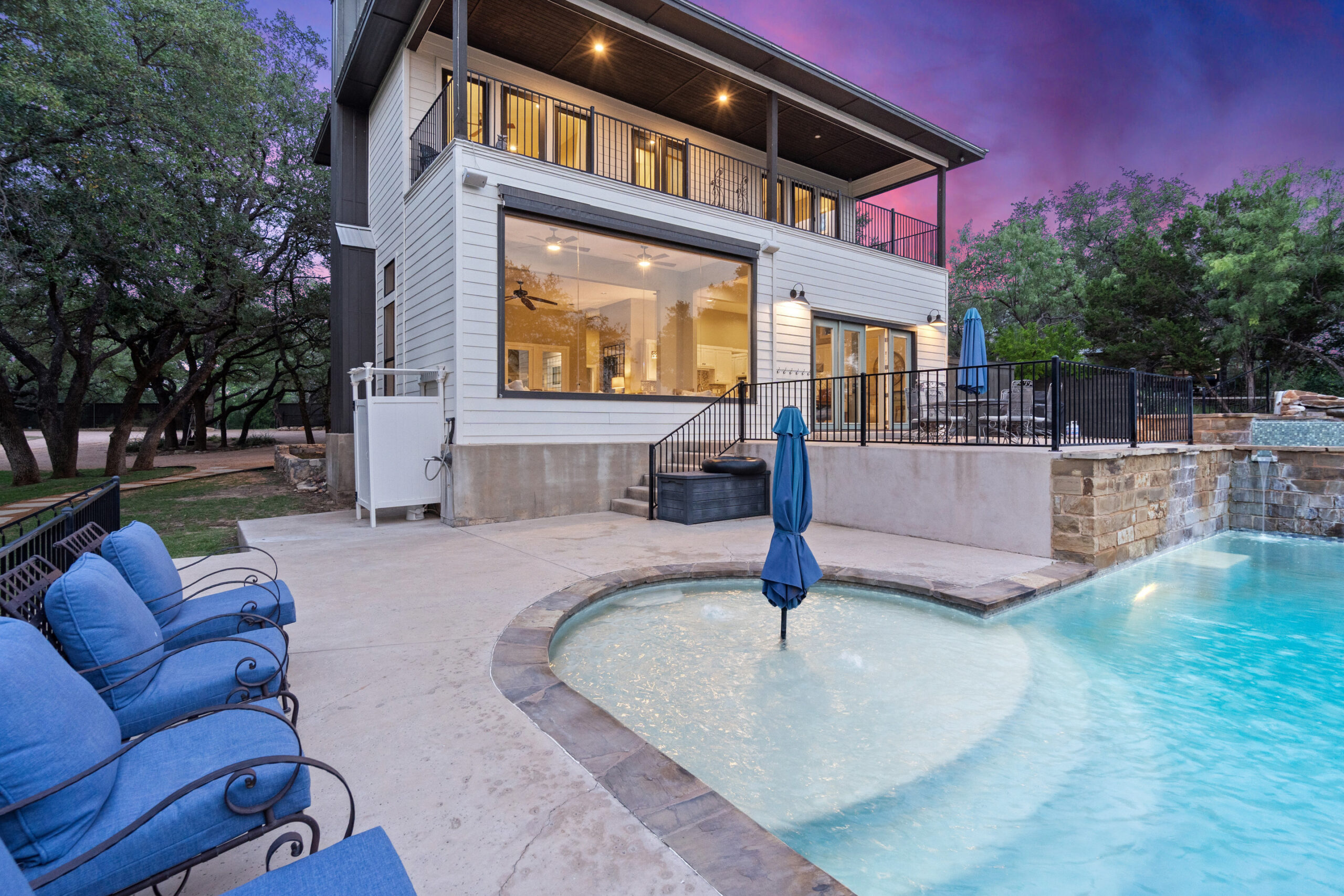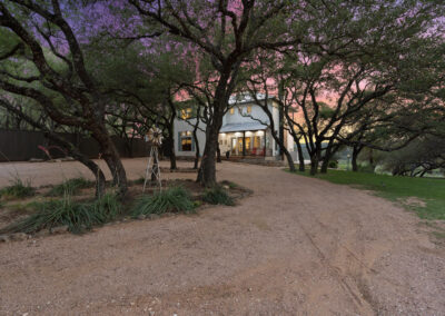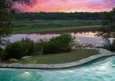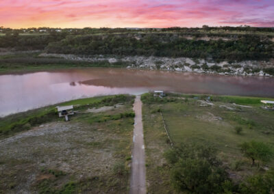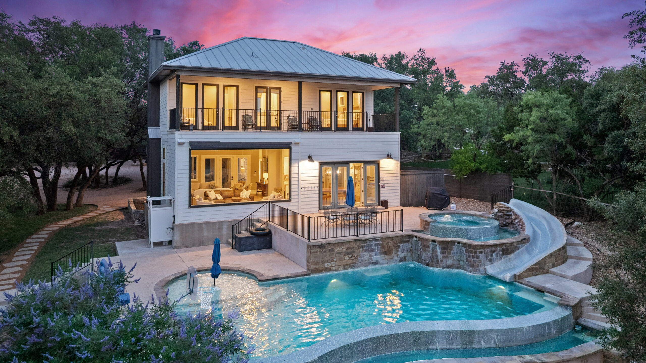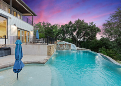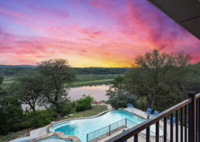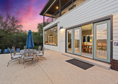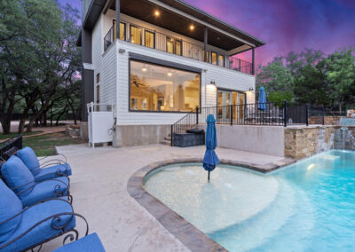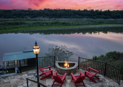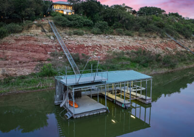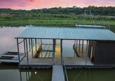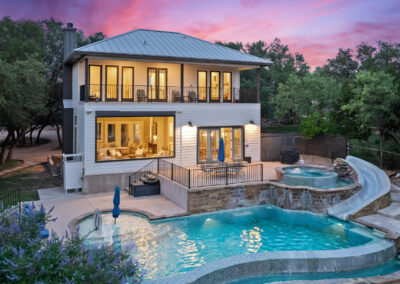 Welcome home to gated waterfront living at Pedernales Bend. The locale is the famous Texas Hill Country where relaxed lake lifestyles are celebrated. Perched over the Pedernales River on an open 1.669 acre lot, this property takes full advantage of its locale. Start your visit at the wide rollaway gate to find a sweeping tree canopy shading the circular drive at the main house. Inside you will find 2,540+/-sq.ft. with an open floor plan, a fireplace, 2 living rooms, dining, and kitchen. Also on this level is the bunk room with loft, a full bath plus the laundry room. Upstairs is 3 bedrooms and 2 baths plus an expansive covered balcony to soak up the sunset views. Relax and play at the pool featuring a spa and custom water slide. Enjoy your evenings around the firepit and gaze at the stars. Continue down the staircase to the boat dock with trapeze swing, storage, boat life and double jet ski lift for days of fun in the sun on Lake Travis. The community boat ramp is just to the north of the property near the RV storage with hookups that is outside the fence but still on the property. Additionally, the 2 story guest house offers 709+/-sq.ft. with 3 beds, 2 baths and a living room. A large portion of the yard is open for enjoying disc golf, tree swing and summer games. Currently used as an Airbnb, this income producing property it the perfect setting for friends and family to get together to make memories for a lifetime.
