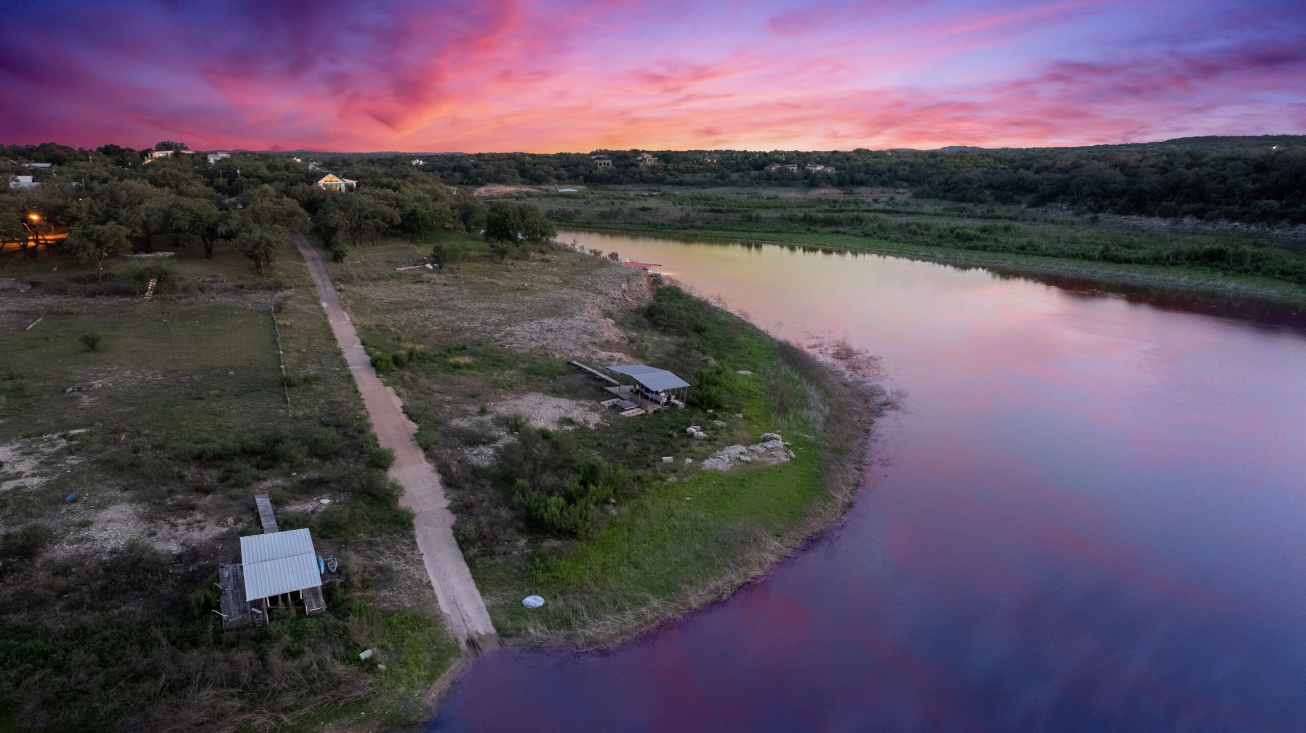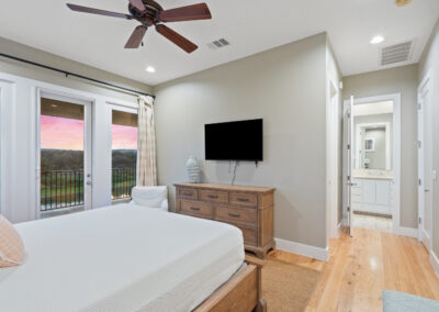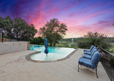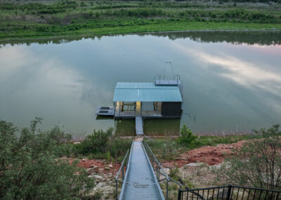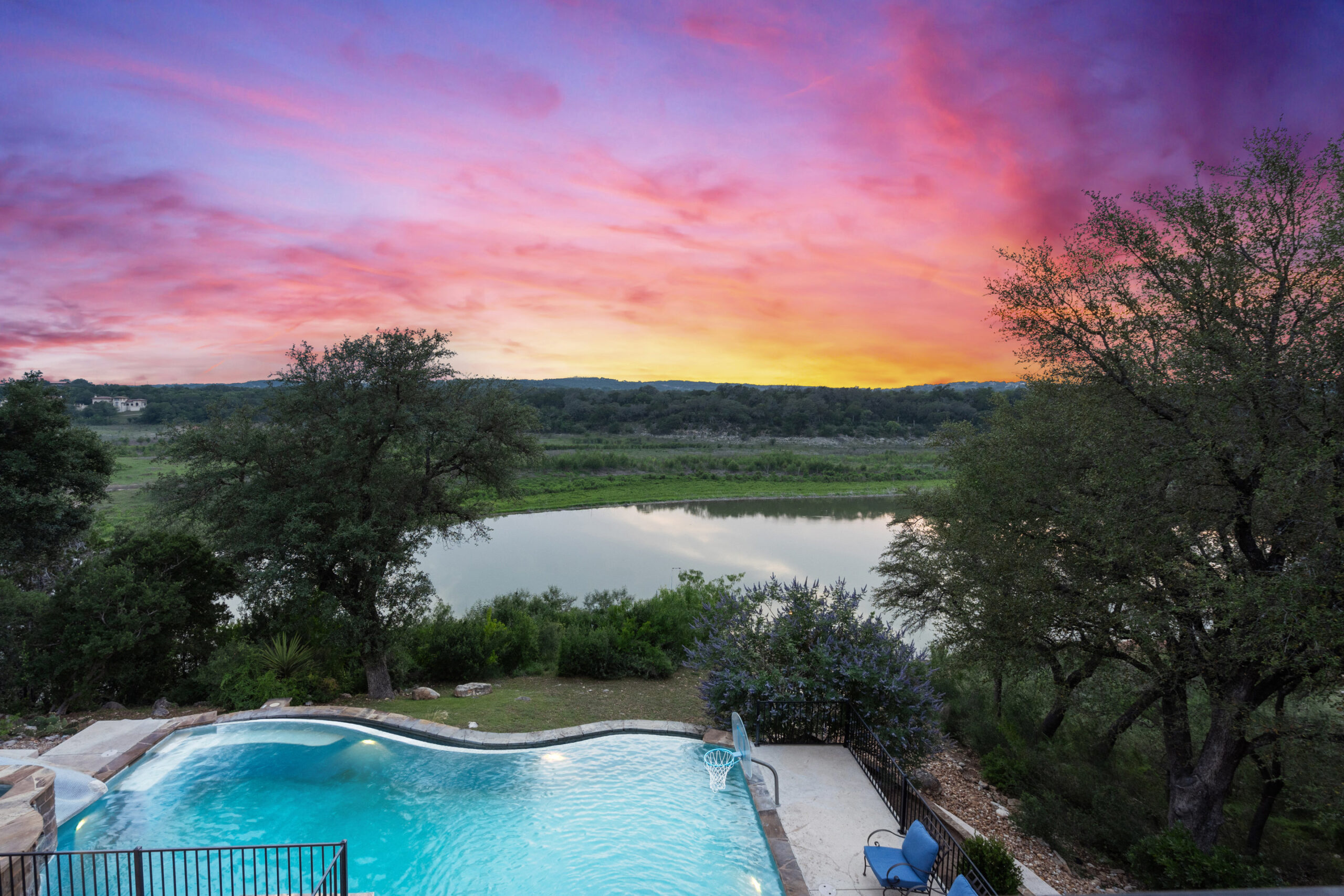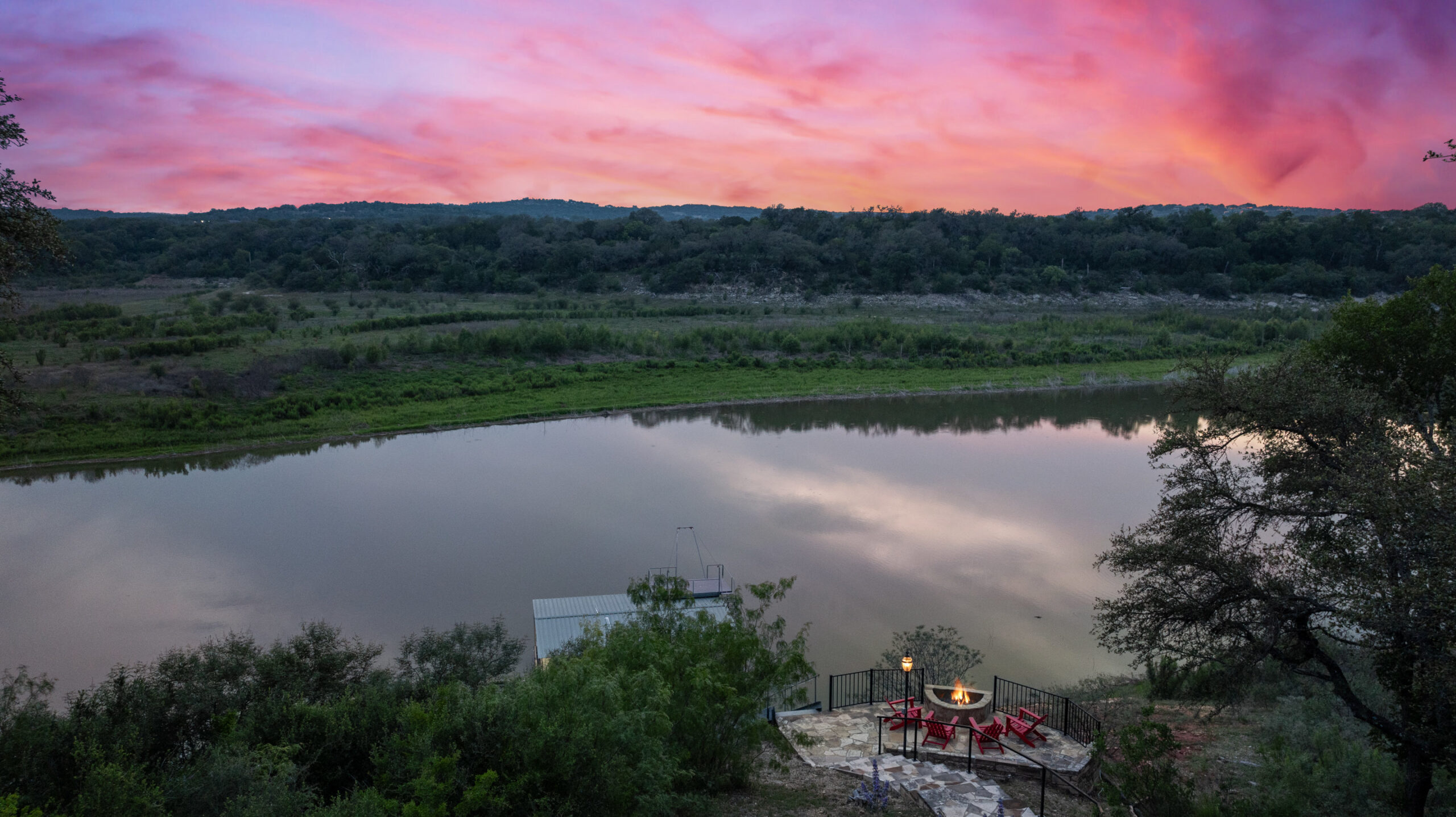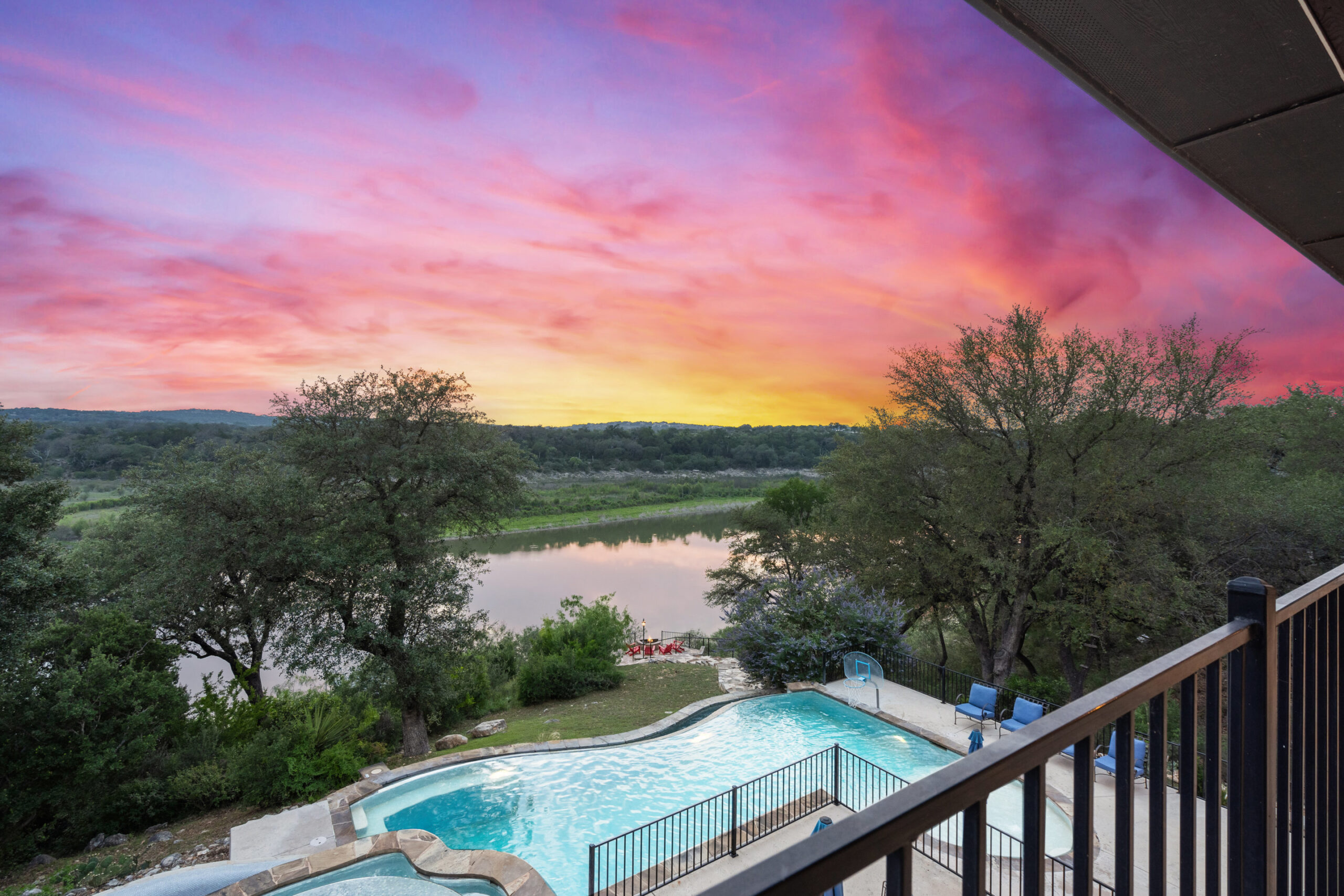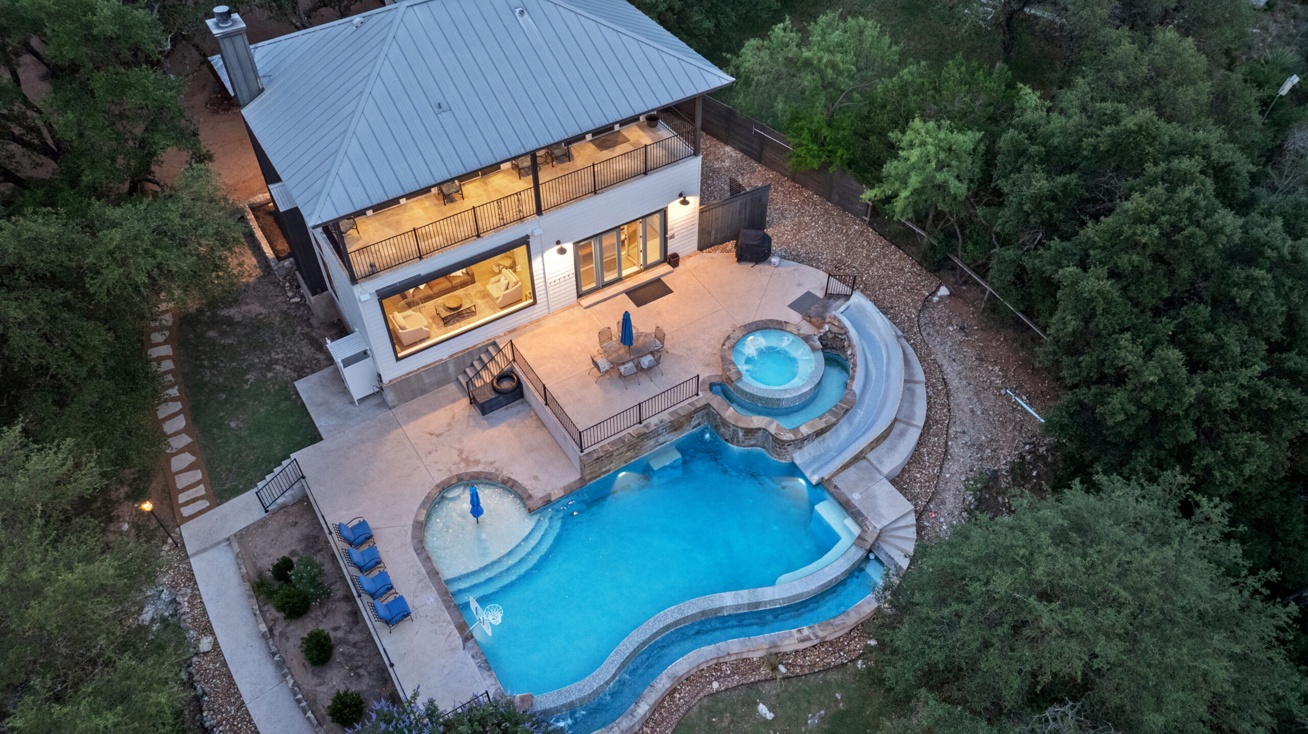 Welcome home to gated waterfront living at Pedernales Bend. The locale is the famous Texas Hill Country where relaxed lake lifestyles are celebrated. Perched over the Pedernales River on an open 1.669 acre lot, this property takes full advantage of its locale. Start your visit at the wide rollaway gate to find a sweeping tree canopy shading the circular drive at the main house. Inside you will find 2,540+/-sq.ft. with an open floor plan, a fireplace, 2 living rooms, dining, and kitchen. Also on this level is the bunk room with loft, a full bath plus the laundry room. Upstairs is 3 bedrooms and 2 baths plus an expansive covered balcony to soak up the sunset views. Relax and play at the pool featuring a spa and custom water slide. Enjoy your evenings around the firepit and gaze at the stars. Continue down the staircase to the boat dock with trapeze swing, storage, boat life and double jet ski lift for days of fun in the sun on Lake Travis. The community boat ramp is just to the north of the property near the RV storage with hookups that is outside the fence but still on the property. Additionally, the 2 story guest house offers 709+/-sq.ft. with 3 beds, 2 baths and a living room. A large portion of the yard is open for enjoying disc golf, tree swing and summer games. Currently used as an Airbnb, this income producing property it the perfect setting for friends and family to get together to make memories for a lifetime.