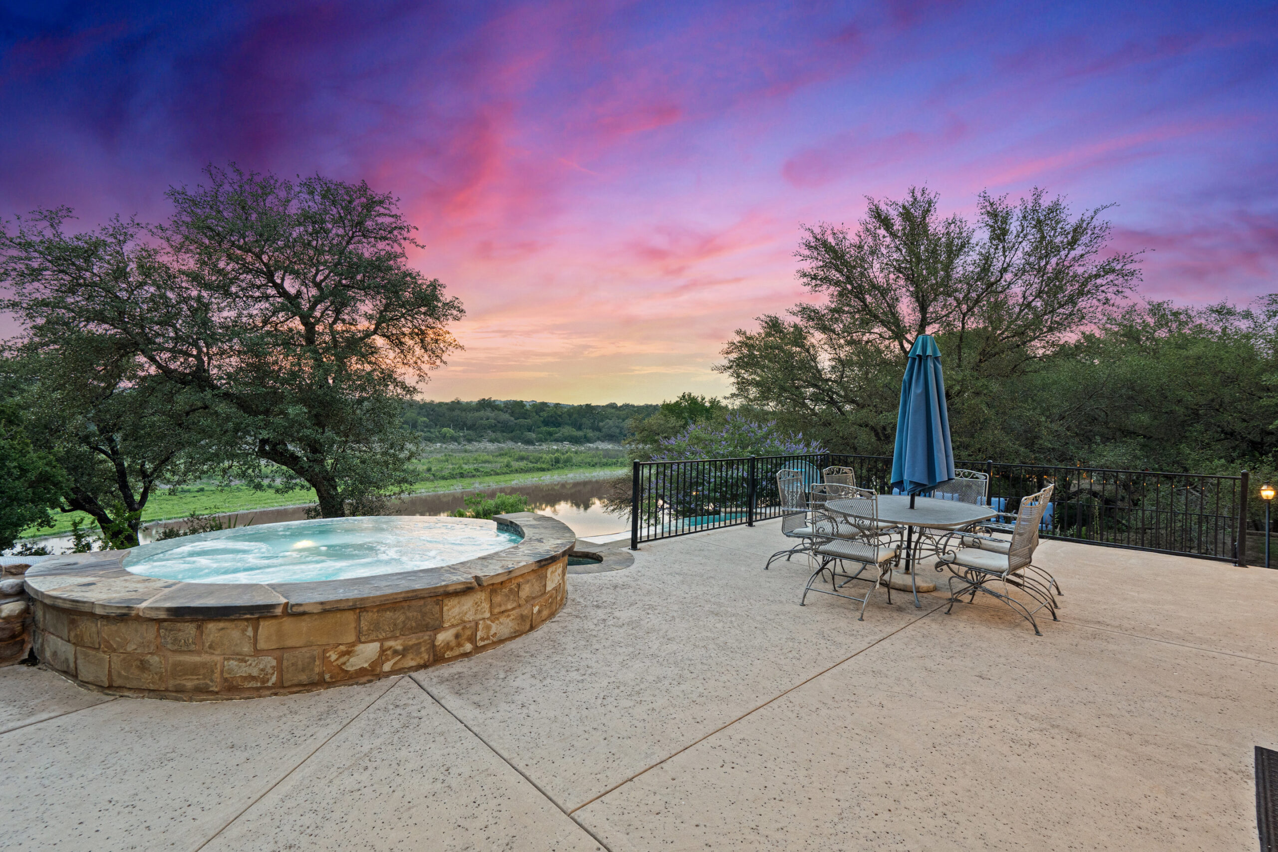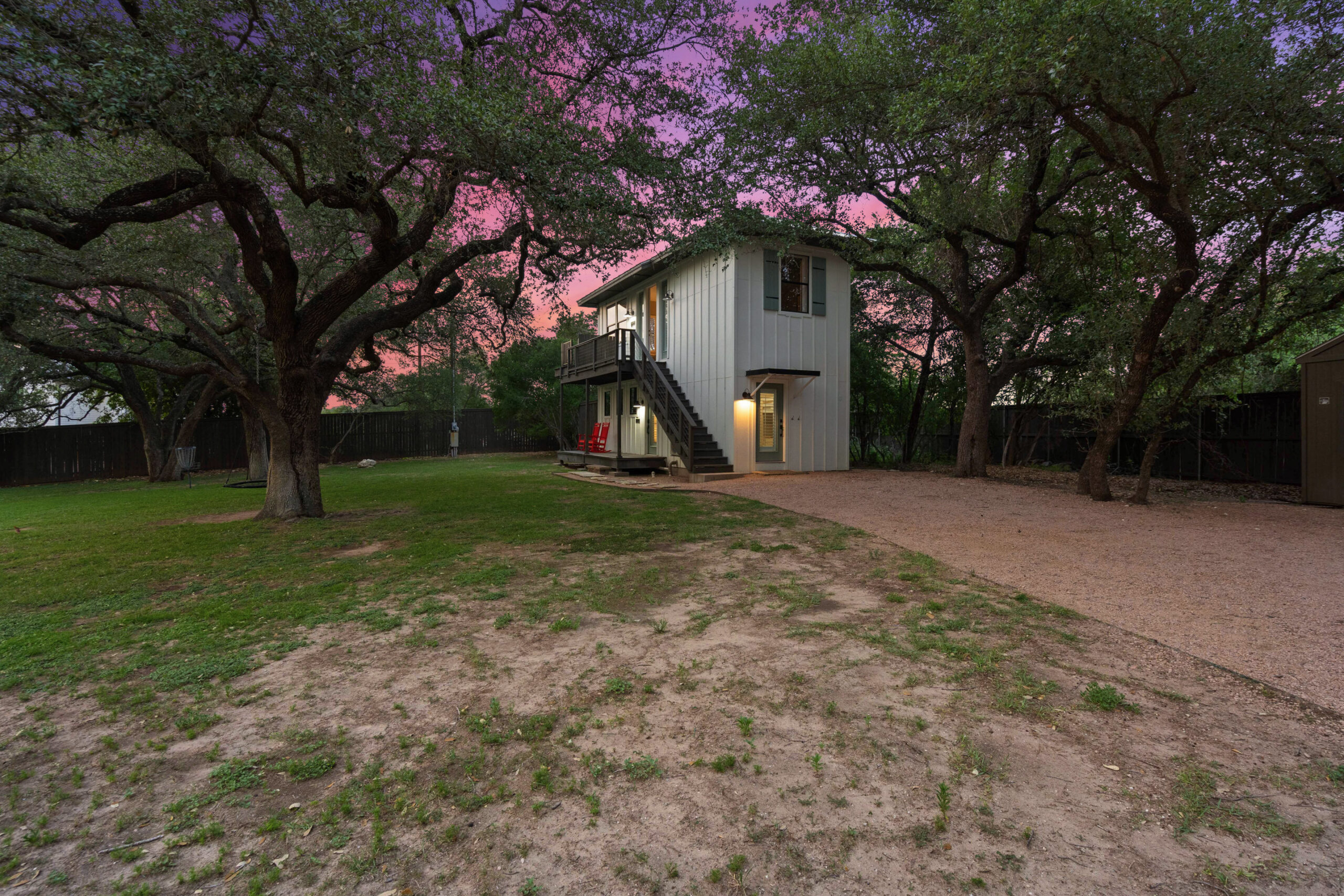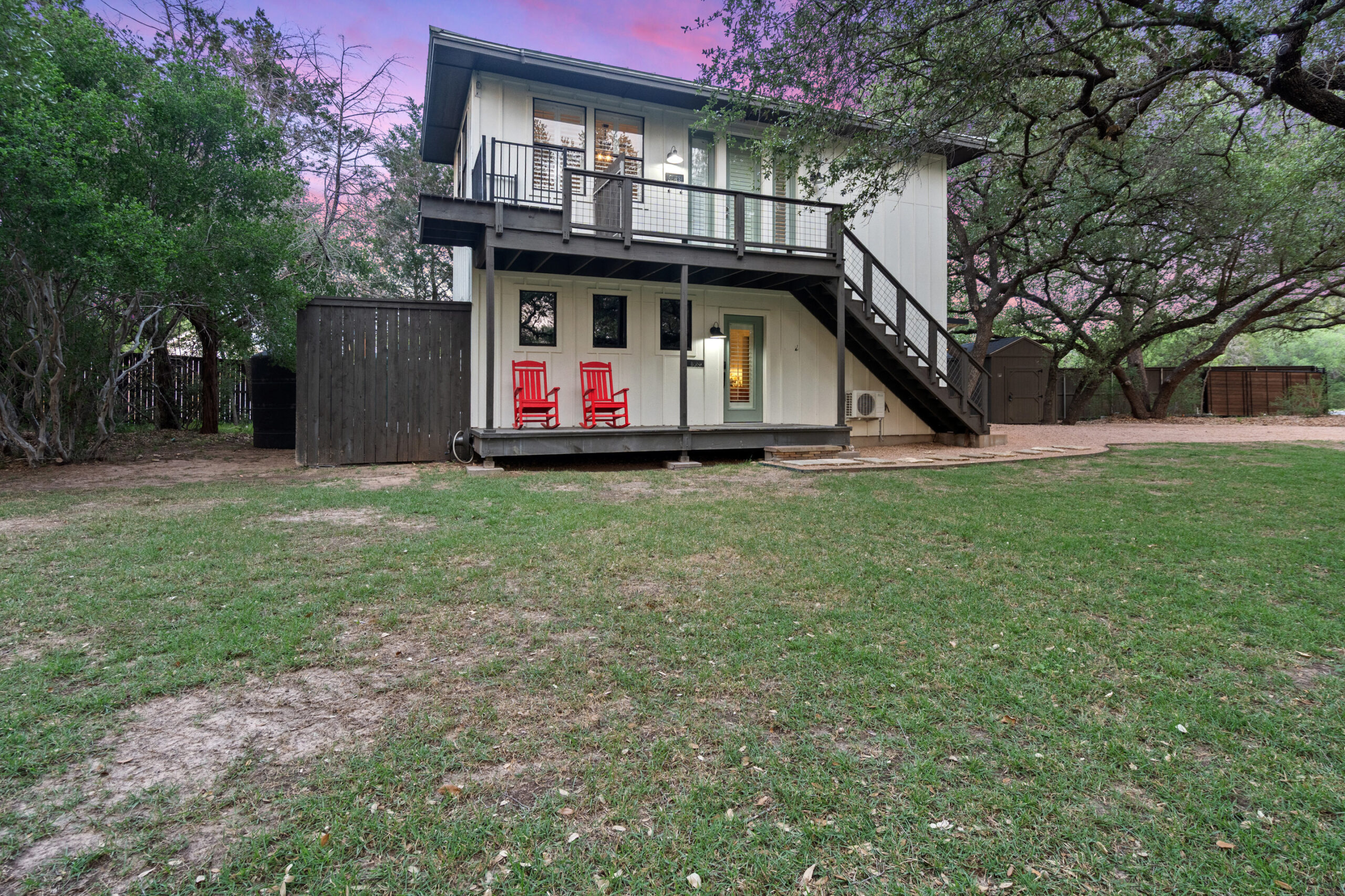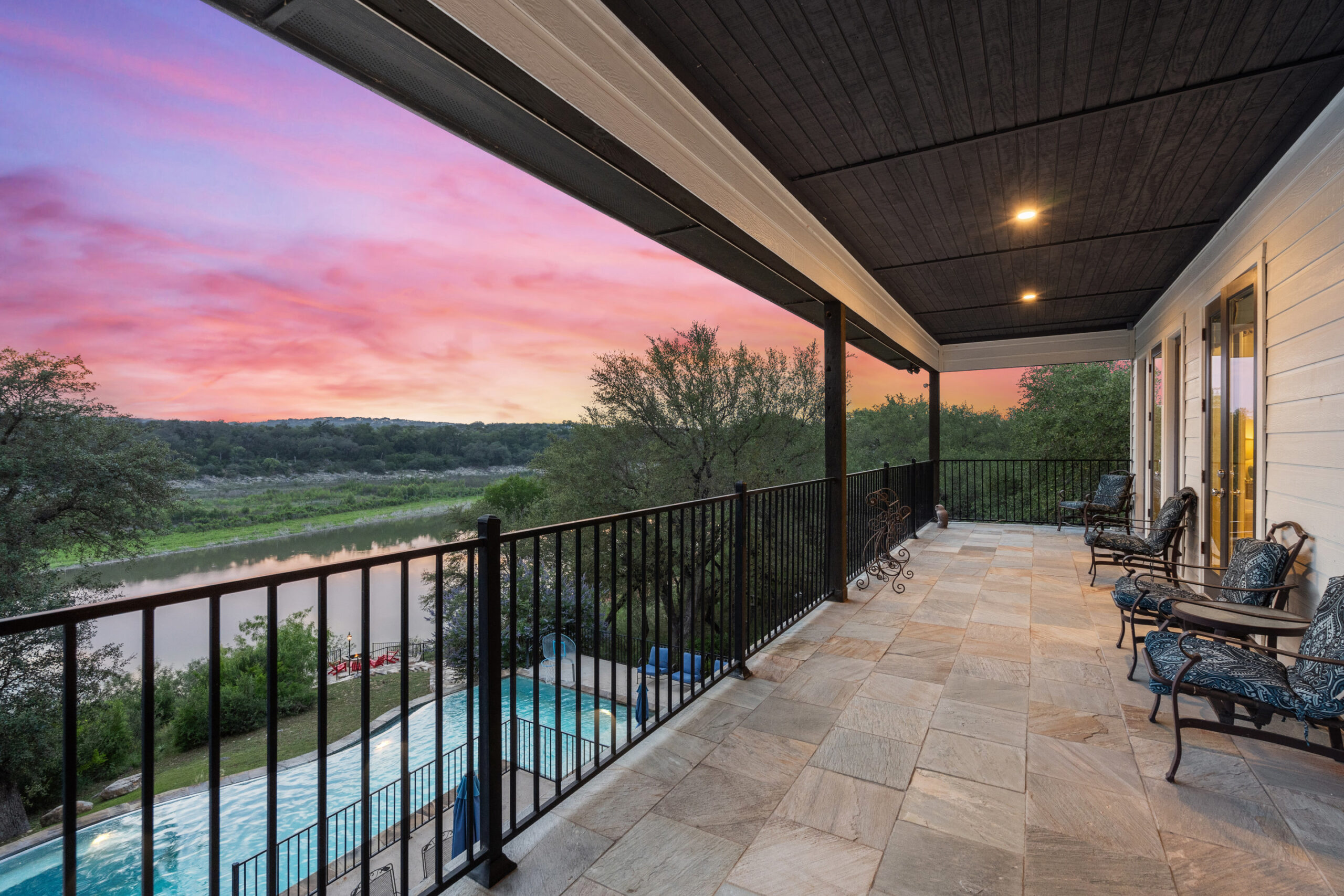 Welcome home to gated waterfront living at Pedernales Bend. The locale is the famous Texas Hill Country where relaxed lake lifestyles are celebrated. Perched over the Pedernales River on an open 1.669 acre lot, this property takes full advantage of its locale. Start your visit at the wide rollaway gate to find a sweeping tree canopy shading the circular drive at the main house. Inside you will find 2,540+/-sq.ft. with an open floor plan, a fireplace, 2 living rooms, dining, and kitchen. Also on this level is the bunk room with loft, a full bath plus the laundry room. Upstairs is 3 bedrooms and 2 baths plus an expansive covered balcony to soak up the sunset views. Relax and play at the pool featuring a spa and custom water slide. Enjoy your evenings around the firepit and gaze at the stars. Continue down the staircase to the boat dock with trapeze swing, storage, boat life and double jet ski lift for days of fun in the sun on Lake Travis. The community boat ramp is just to the north of the property near the RV storage with hookups that is outside the fence but still on the property. Additionally, the 2 story guest house offers 709+/-sq.ft. with 3 beds, 2 baths and a living room. A large portion of the yard is open for enjoying disc golf, tree swing and summer games. Currently used as an Airbnb, this income producing property it the perfect setting for friends and family to get together to make memories for a lifetime.