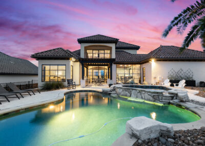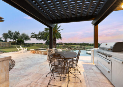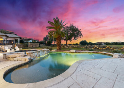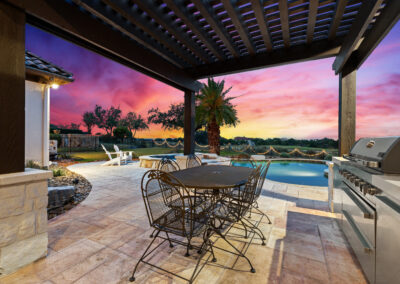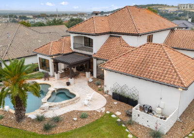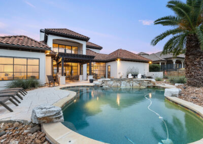 Welcome home to refined gated living in Flintrock Falls. This gorgeous hill country residence was a former Parade of Homes property boasting an exceptional location backing to the 4th green. As you arrive an impressive approach greets you with lush landscaping, circular drive, double front doors, porte cochere and motor court. The interior is just as intriguing with luxe finishes everywhere you look including wood and stone flooring under custom ceilings. Enjoy easy everyday comfort with an open floor plan filled with natural light, private study, a bar at the formal dining plus a stylish fireplace in the living room and floor to ceiling windows. The primary suite offers a luxurious retreat featuring a soaking tub, seamless glass walk in shower with rain showerhead plus a California closet that will make your jaw drop. Upstairs you will find 2 spacious bedrooms both with ensuite baths plus a fantastic game/media room with built in Murphy bed, bar, half bath, and balcony that are perfect for entertaining or an extra guest room. We saved the best for last – the resort style back yard will make you feel like you are on vacation with its pool, spa, patios, and the best panoramic golf views in the area. With over $350k in upgrades, this home is one you don’t want to miss.