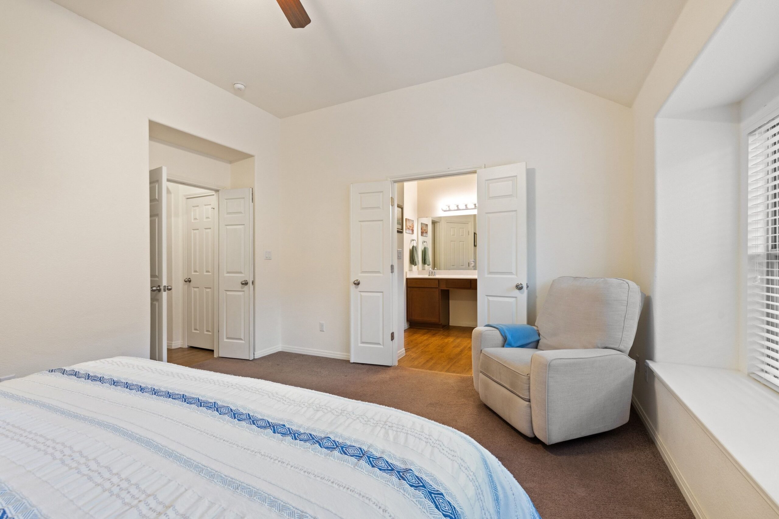 The tranquil primary suite includes a 10-foot vaulted ceiling, window seat, and ensuite bath with double vanity, soaking tub, walk-in shower, private water closet, and walk-in closet. Two generously sized secondary bedrooms with large closets share a full bath at the back of the home. The extra-deep wraparound fenced backyard provides ample space to relax on the porch or patio, with no rear neighbor and peaceful wooded views enhancing privacy.