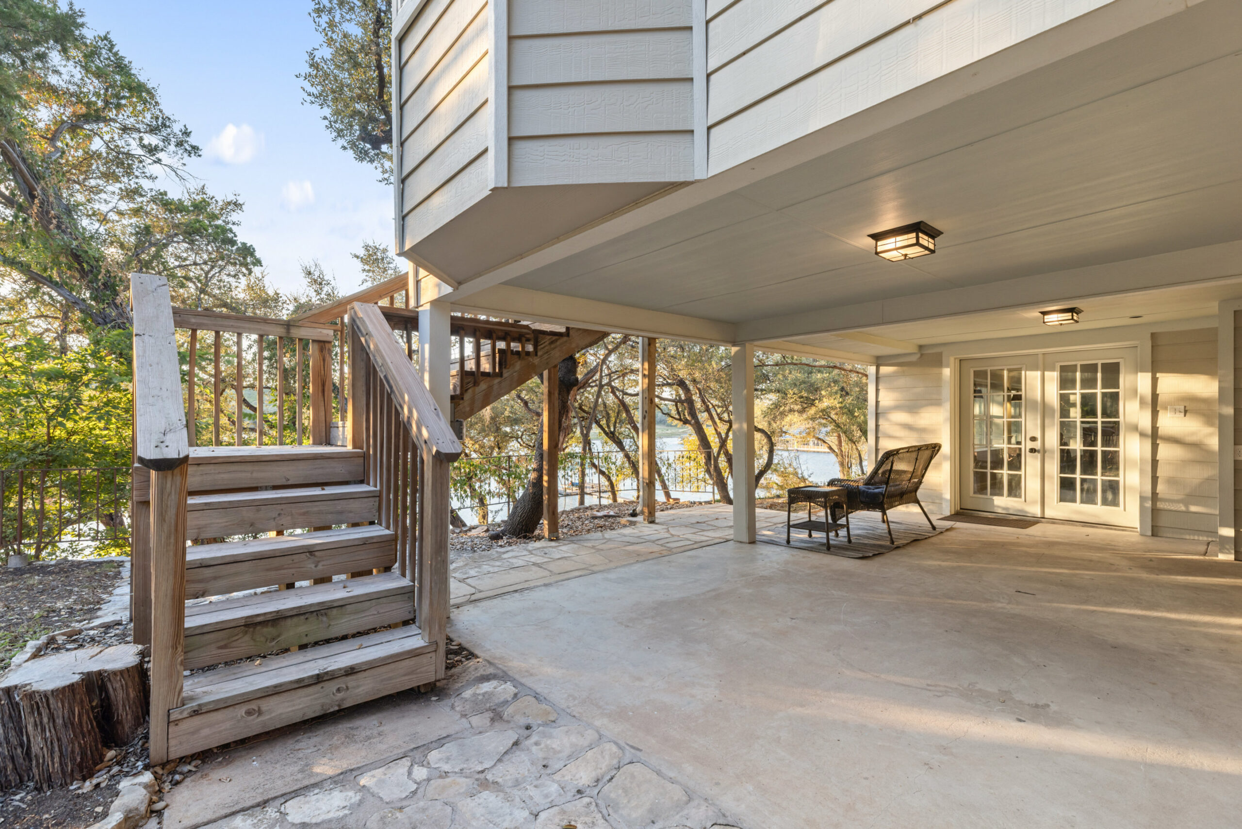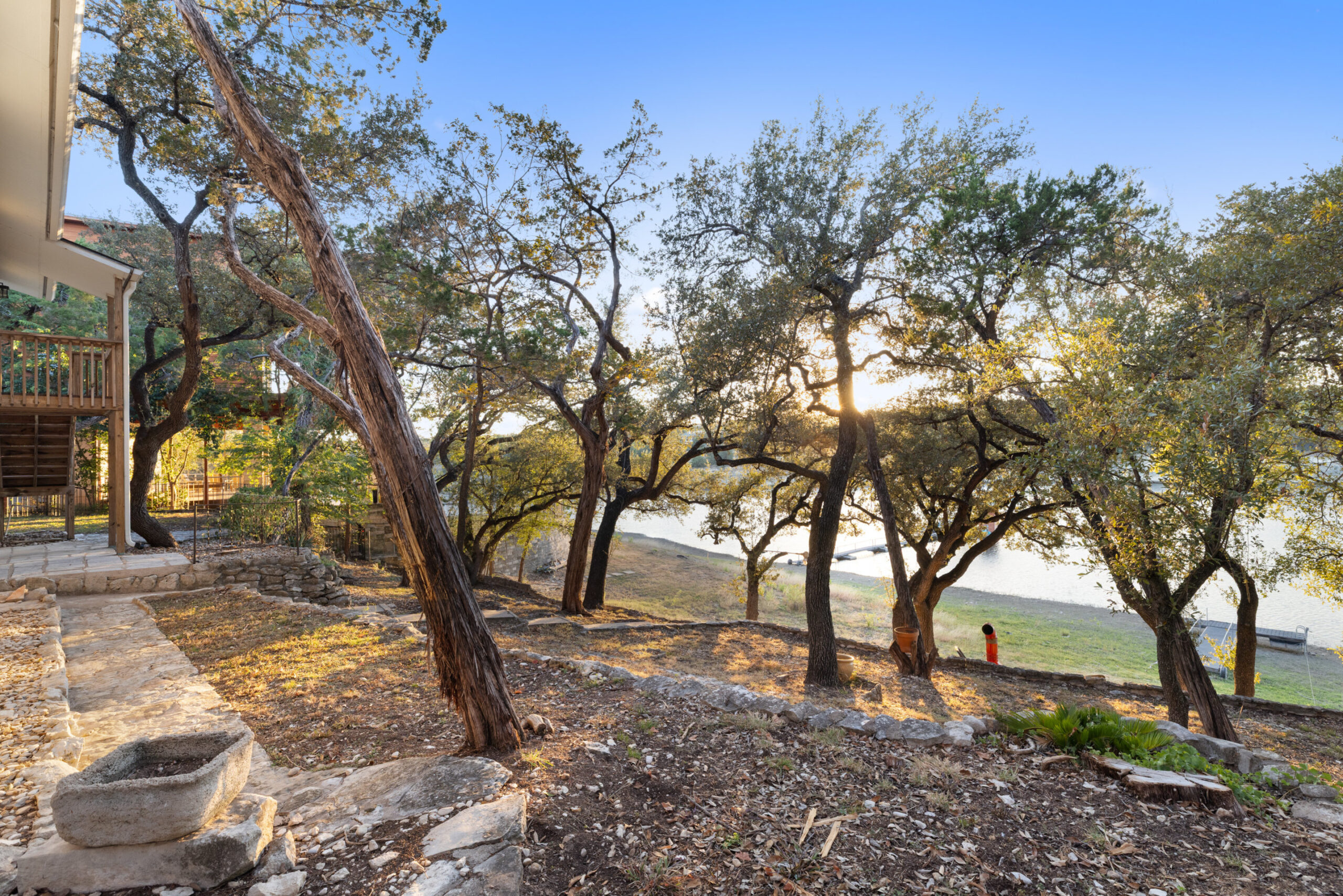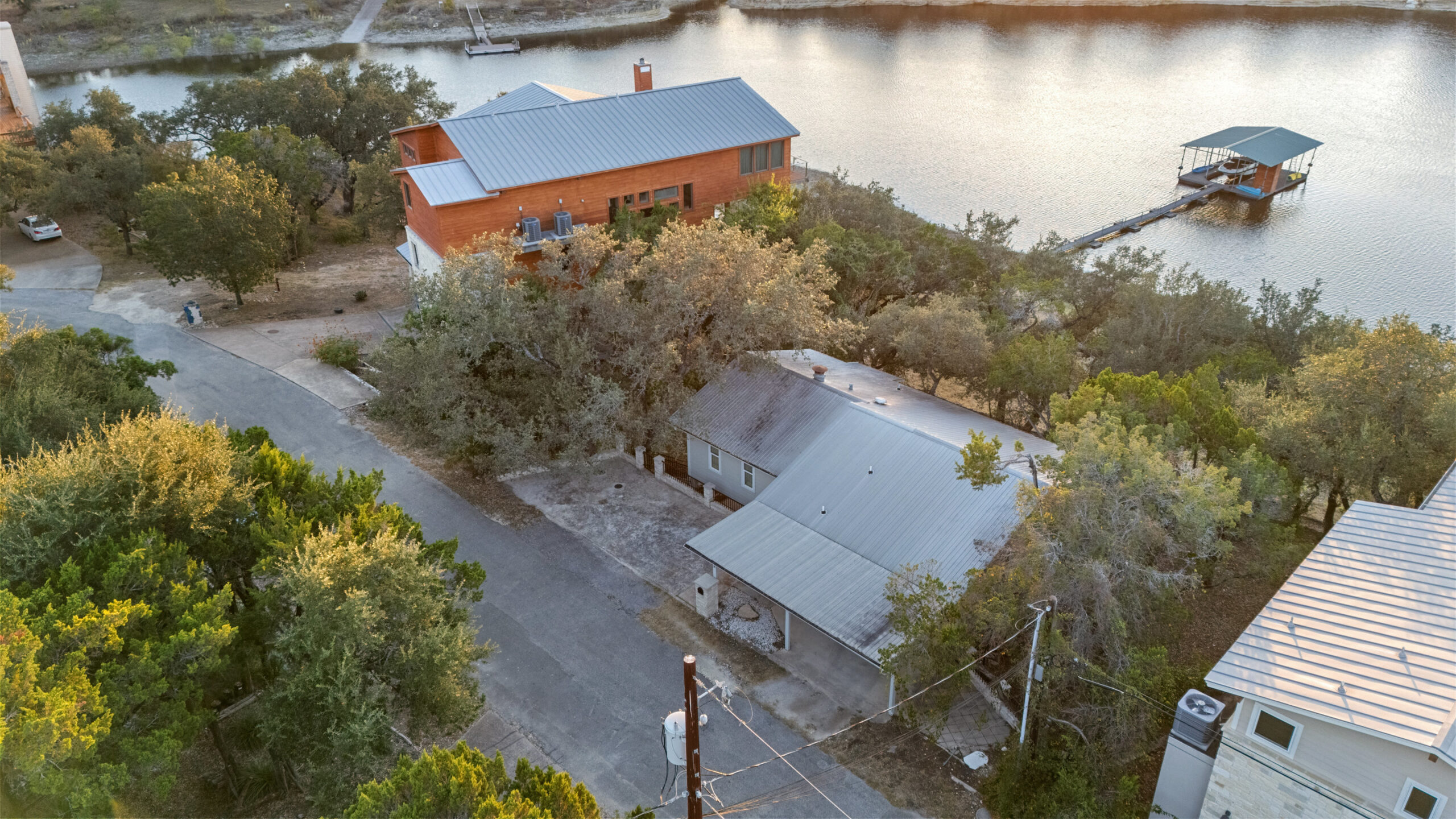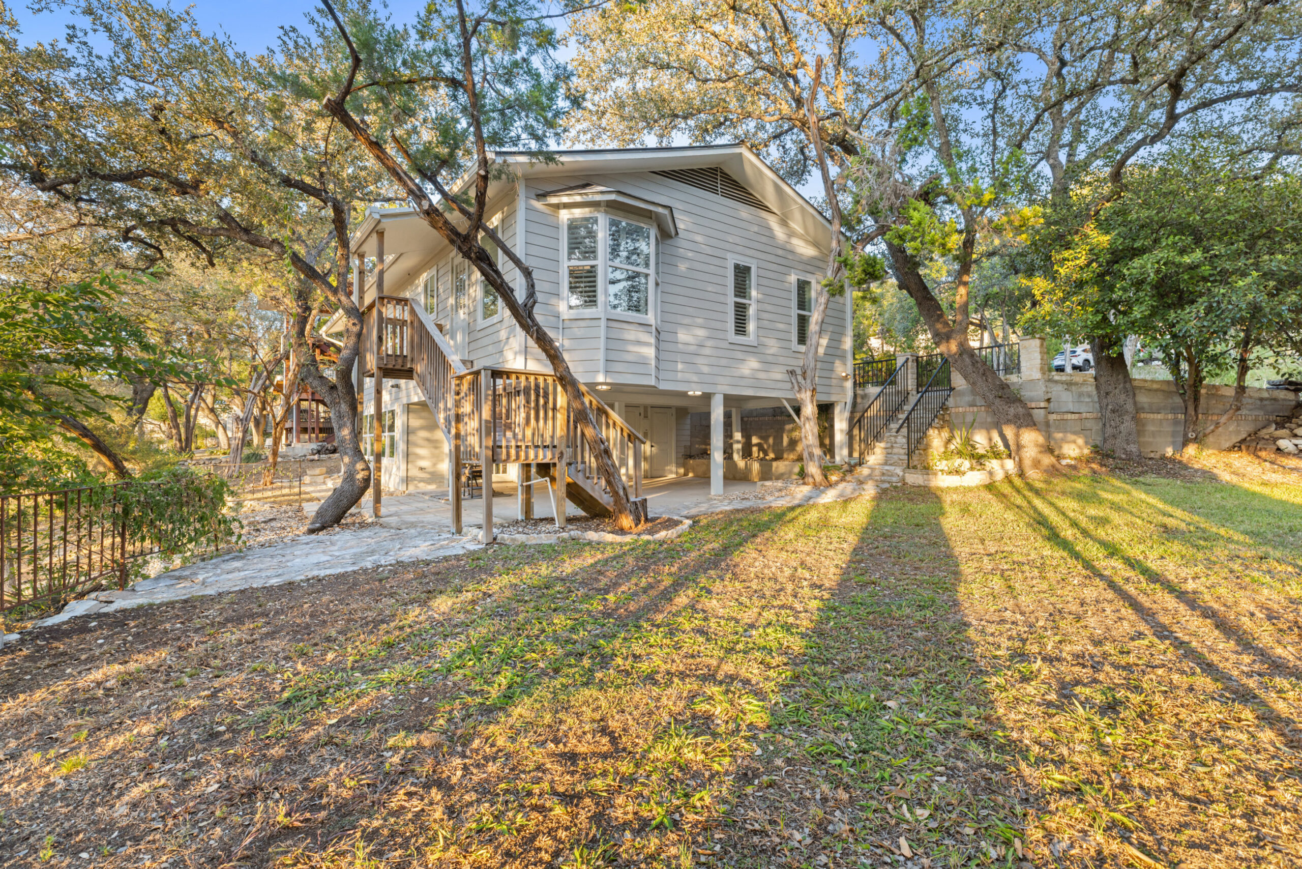 Welcome home to waterfront living on Lake Travis. This beautiful 1,974+/-sq.ft., 3 bed, 3 bath home is nestled on a wooded lot across the cove from Lakeway City Park. The main living is an open kitchen, dining and living room awash in natural light from an abundance of windows. The kitchen boasts Silestone counters, stainless appliances, electric cooktop, and gorgeous cabinets. A tranquil primary suite offers beamed ceiling, desk nook, walk in closet and a serene bath with walk in shower. Two spacious secondary bedrooms share the hall bath with a tub/shower combo. The downstairs is a massive second living room ready to be a game room, media room, hobby room or study with its own full bath. There’s lots of storage available in the oversized laundry room, walk in closet under the stairs plus 3 closets on the covered patio. The .30 acre lot provides plenty of room for a pool, spa or anything else you would like to design. Enjoy exceptional views of the lake under the shaded tree canopy and shoreline. This is a lifestyle you do not want to miss. This property can also be a short term rental.