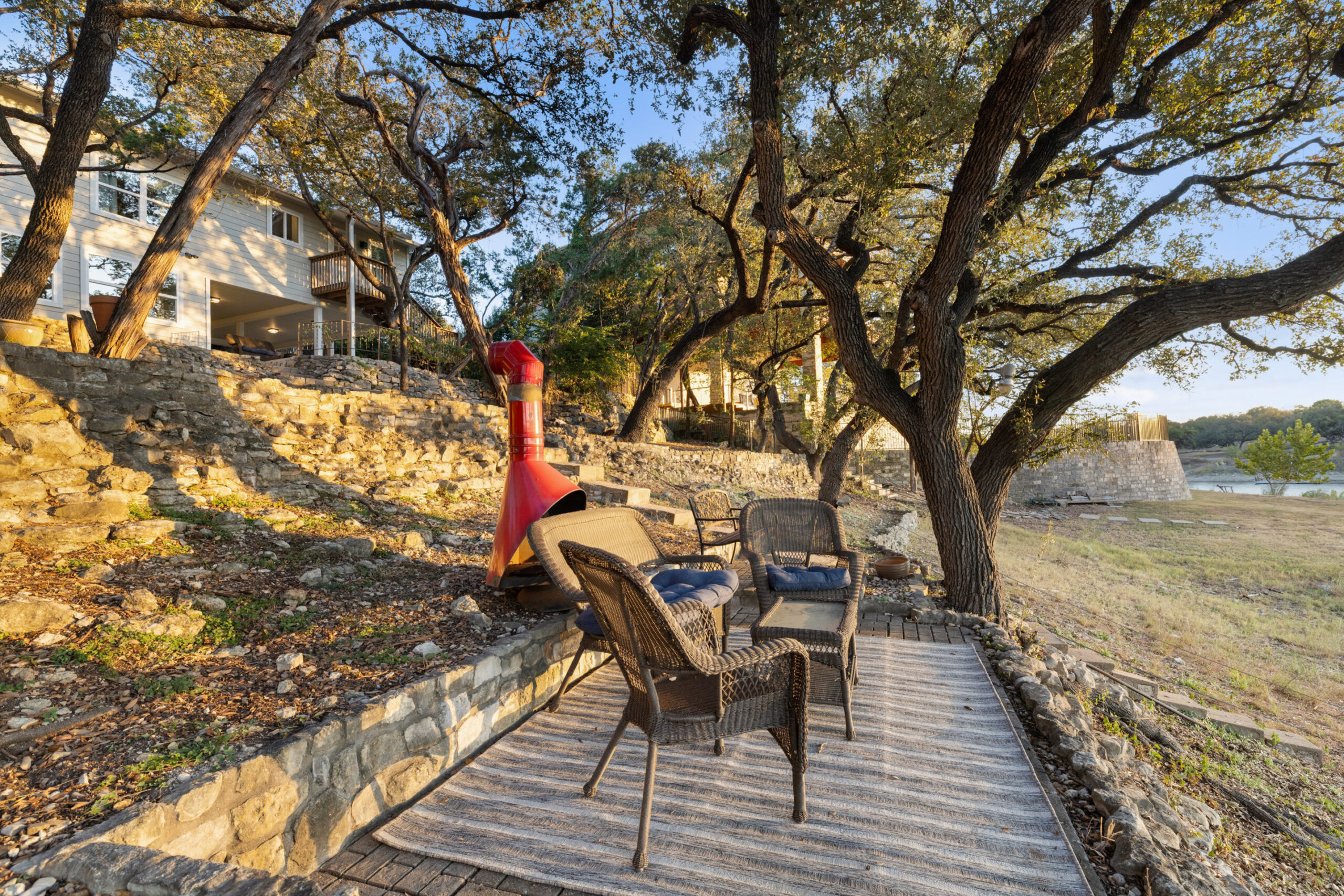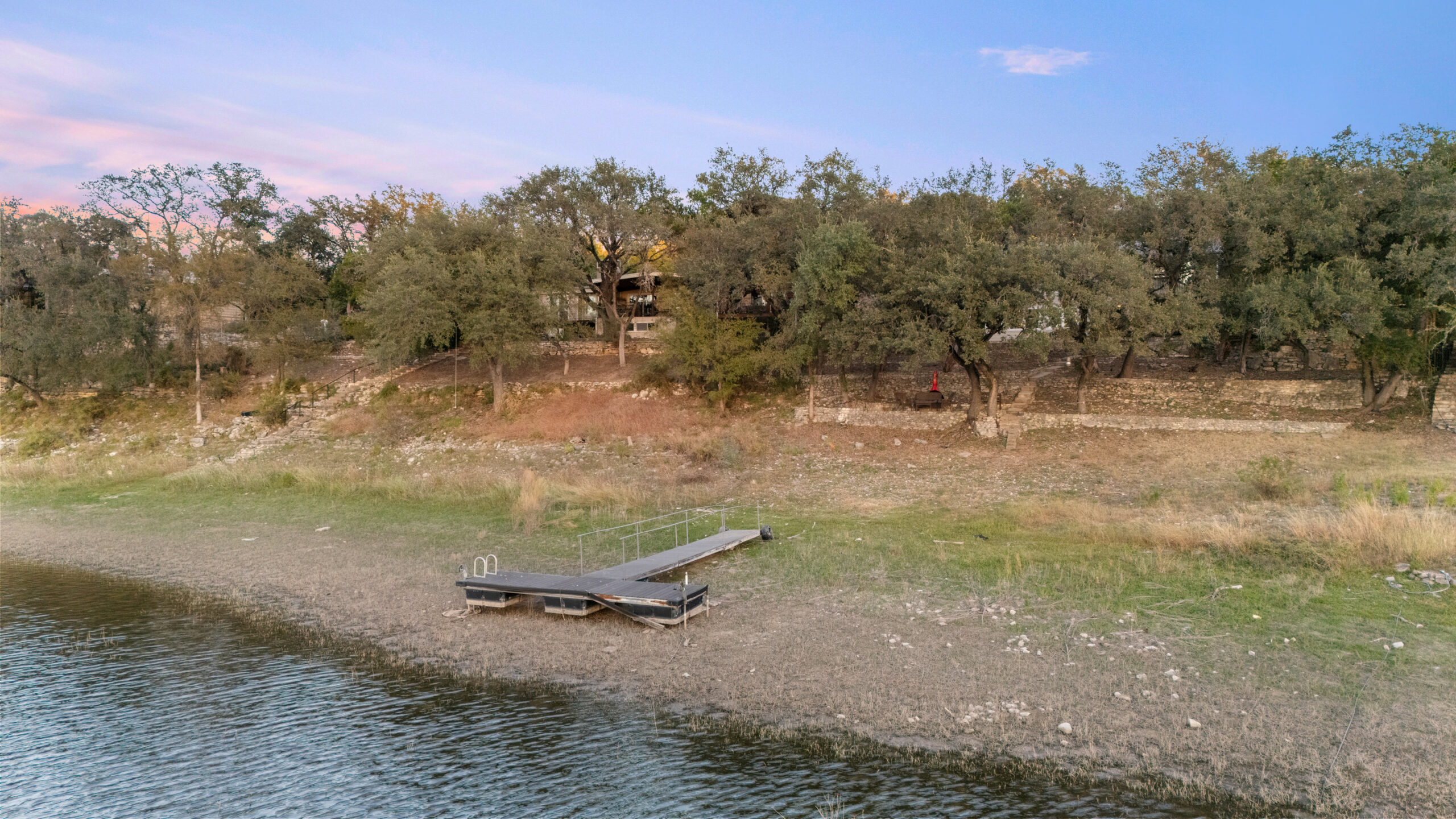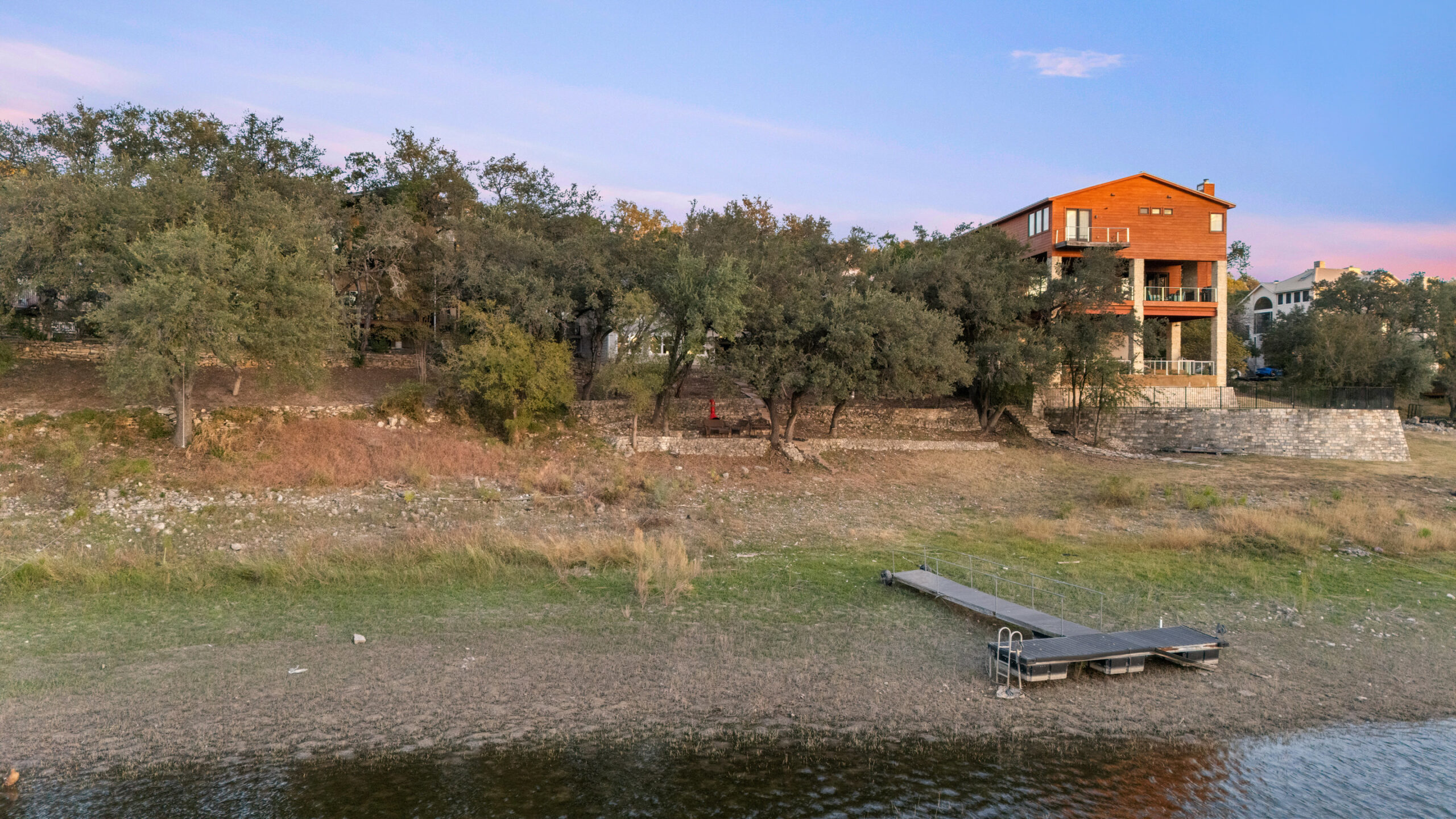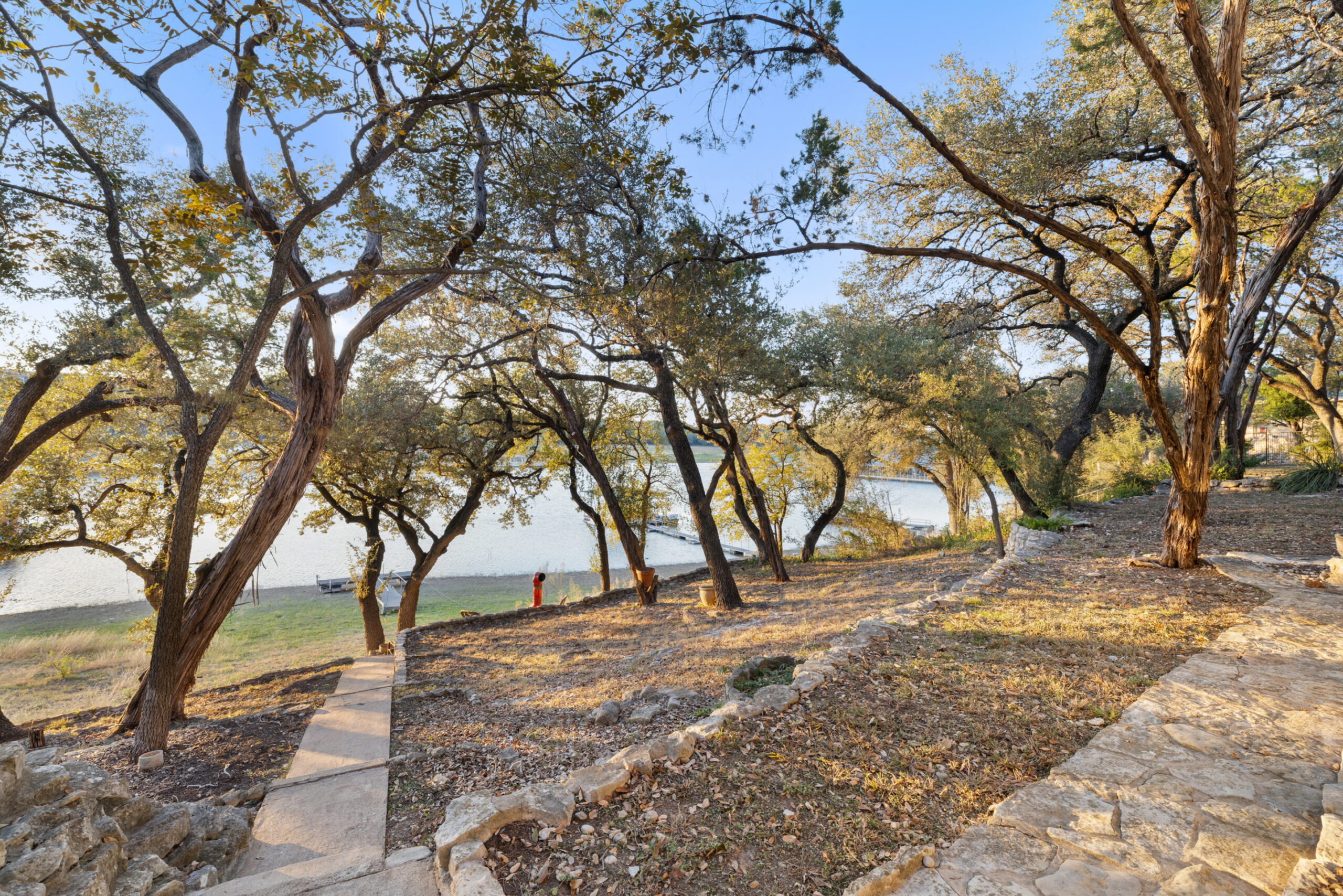 Welcome home to waterfront living on Lake Travis. This beautiful 1,974+/-sq.ft., 3 bed, 3 bath home is nestled on a wooded lot across the cove from Lakeway City Park. The main living is an open kitchen, dining and living room awash in natural light from an abundance of windows. The kitchen boasts Silestone counters, stainless appliances, electric cooktop, and gorgeous cabinets. A tranquil primary suite offers beamed ceiling, desk nook, walk in closet and a serene bath with walk in shower. Two spacious secondary bedrooms share the hall bath with a tub/shower combo. The downstairs is a massive second living room ready to be a game room, media room, hobby room or study with its own full bath. There’s lots of storage available in the oversized laundry room, walk in closet under the stairs plus 3 closets on the covered patio. The .30 acre lot provides plenty of room for a pool, spa or anything else you would like to design. Enjoy exceptional views of the lake under the shaded tree canopy and shoreline. This is a lifestyle you do not want to miss. This property can also be a short term rental.
