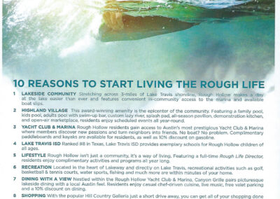 The Location: Just 30 minutes from downtown Austin you will find Rough Hollow – a resort style community on the prestigious South shore of Lake Travis. Featuring direct lake access, breathtaking Hill Country views and world-class amenities such as the Rough Hollow Yacht Club and Marina(mandatory monthly membership of $81.19), Canyon Grille, miles of hike and bike trails, luxurious pools, gym, pavilion & Highland Village: a water-themed amenities center. Rough Hollow offers an unparalleled lakeside lifestyle close to dining, shopping, golf & tennis. It’s all here waiting for you to come live the “Rough Life.